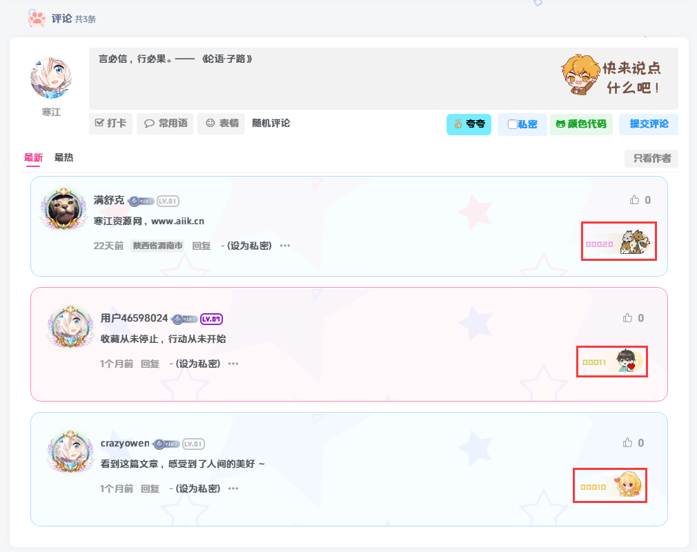 百度已收录 子比主题美化-评论区显示漂亮的用户ID徽章背景卡片样式寒江1年前更新关注私信04206子比主题美化-评论区显示漂亮的用户ID徽章背景卡片样式此内容为付费阅读,请付费后查看500积分黄金会员200钻石会员免费登录购买付费阅读已售 29 给自己的评论区添加一个漂亮的徽章美化,觉得挺好看的,这里做一下记录。食用方法:首先在网站/wp-content/themes/zibll主题目录下新增func.php文件(子比主题推荐放这里!此文件不会随着更新主题版本消失,有的话就不用管)加入以下代码: 此处内容已隐藏,请付费后查看CSS代码 此处内容已隐藏,请付费后查看 温馨提示:本文最后更新于2024-03-21 21:22:56,某些文章具有时效性,若有错误或已失效,请在下方留言或联系网站客服。 本站代码模板仅供学习交流使用请勿商业运营,严禁从事违法,侵权等任何非法活动,否则后果自负! ------本页内容已结束,喜欢请分享------ 三月 21 本站历史上的今天 2025:03月22日,星期六, 每天60秒读懂全世界! (0) © 版权声明 版权声明 1 本网站名称:寒江资源网 2 本站永久网址:https://www.aiik.cn 3 本网站的文章部分内容可能来源于网络,仅供大家学习与参考,如有侵权,请发送邮件到:hjyunl@163.com我们将72小时内进行删除处理。 4 本站一切资源不代表本站立场,并不代表本站赞同其观点和对其真实性负责。 5 本站一律禁止以任何方式发布或转载任何违法的相关信息,访客发现请向站长举报 6 本站资源大多存储在云盘,如发现链接失效,请联系我们我们会第一时间更新。 7 本站所有资源免费,付费资源仅为抵消人工测试和维护服务器日常所带来的消耗成本。 吼吼~~ 我是一条底线哟~网站美化# 子比主题美化# 代码# 子比# 子比主题# 自定义# 自定义CSS# 美化# 评论区 喜欢就支持一下吧点赞6赞赏 分享QQ空间微博QQ好友海报分享复制链接收藏 寒江关注 0551923.5W+ 子比主题美化-文章缩略图角标子比主题美化-文章缩略图角标1年前 537给WordPress后台实现显示注册用户IP和最近登录IP教程给WordPress后台实现显示注册用户IP和最近登录IP教程2年前 463子比主题美化-分享一些LV等级和VIP等级图标子比主题美化-分享一些LV等级和VIP等级图标2年前 417子比主题美化-网站底部信息统计模块自动获取日期及访问者IP子比主题美化-网站底部信息统计模块自动获取日期及访问者IP2年前 410子比主题美化-子比美化插件炙焰美化全开源插件V3.2版本子比主题美化-子比美化插件炙焰美化全开源插件V3.2版本2年前 406子比主题抽奖插件最新版V2.6.8授权版子比主题抽奖插件最新版V2.6.8授权版1年前 390 上一篇 子比主题美化-首页排行榜样式美化 下一篇 子比主题美化-网站自定义字体 相关推荐 子比主题美化-文章缩略图角标子比主题美化-文章缩略图角标1年前 537子比主题美化-评论区显示漂亮的用户ID徽章背景卡片样式子比主题美化-评论区显示漂亮的用户ID徽章背景卡片样式1年前 420子比主题美化-分享一些LV等级和VIP等级图标子比主题美化-分享一些LV等级和VIP等级图标2年前 417子比主题美化-网站底部信息统计模块自动获取日期及访问者IP子比主题美化-网站底部信息统计模块自动获取日期及访问者IP2年前 410子比主题美化-子比美化插件炙焰美化全开源插件V3.2版本子比主题美化-子比美化插件炙焰美化全开源插件V3.2版本2年前 406子比主题抽奖插件最新版V2.6.8授权版子比主题抽奖插件最新版V2.6.8授权版1年前 390 评论 抢沙发 请登录后发表评论 登录 注册 社交账号登录QQ登录微信登录微博登录支付宝登录GitHub登录 请登录后查看评论内容